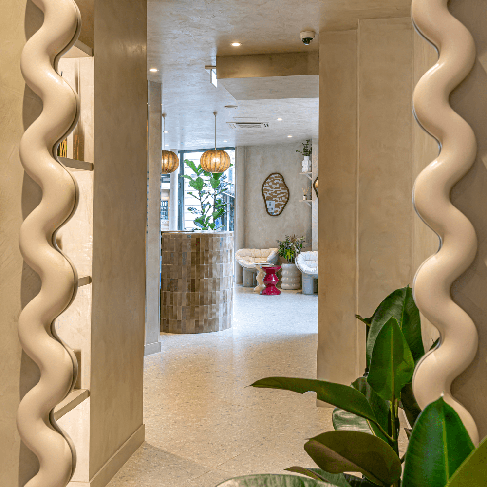 Le bar d’accueil, élément emblématique de The New Me, a été conçu sur mesure avec son revêtement en zellige. Il marque l’entrée dans l’univers du studio : un espace pensé comme une parenthèse chaleureuse où les clients peuvent prendre un café, échanger, travailler ou simplement patienter dans une atmosphère apaisante. Cet espace cocooning joue un rôle clé dans l’expérience globale du lieu.