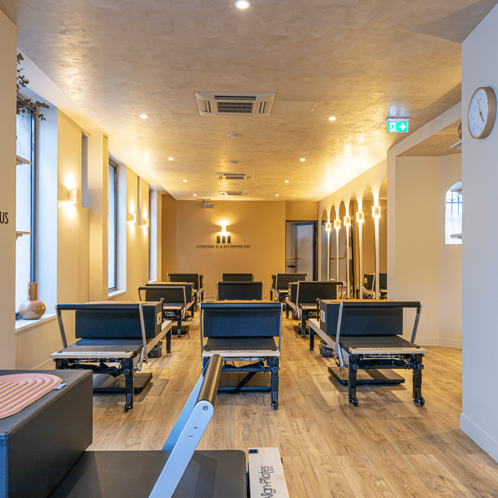 L’identité du studio repose sur une esthétique naturelle élégante, les tons doux et neutres instaurent une atmosphère calme, tandis que les matériaux nobles affirment la dimension premium du concept Pilates Reformer.